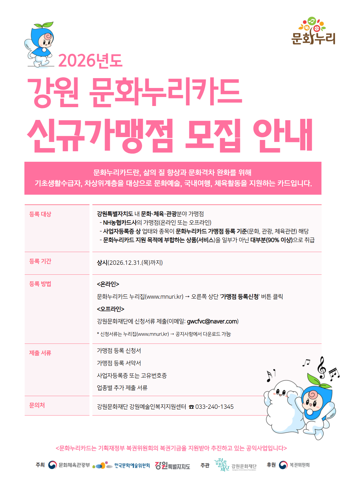 2026년 강원 문화누리카드 신규가맹점 모집 안내