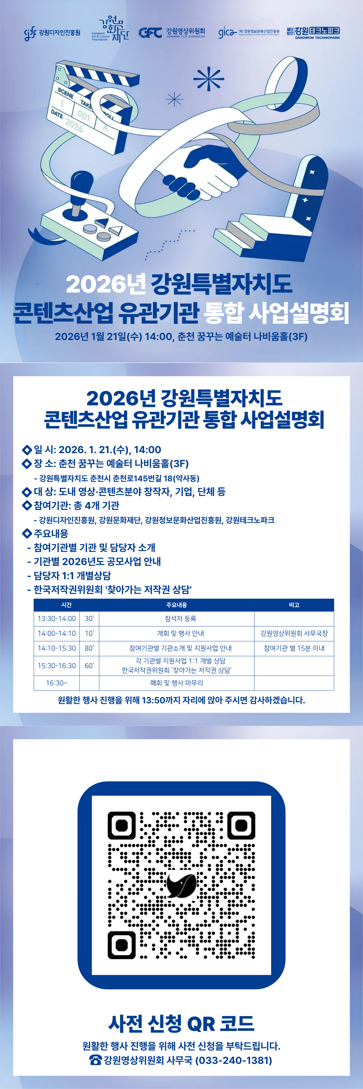 2026년 강원특별자치도 콘텐츠산업 유관기관 통합 사업설명회를 개최합니다.