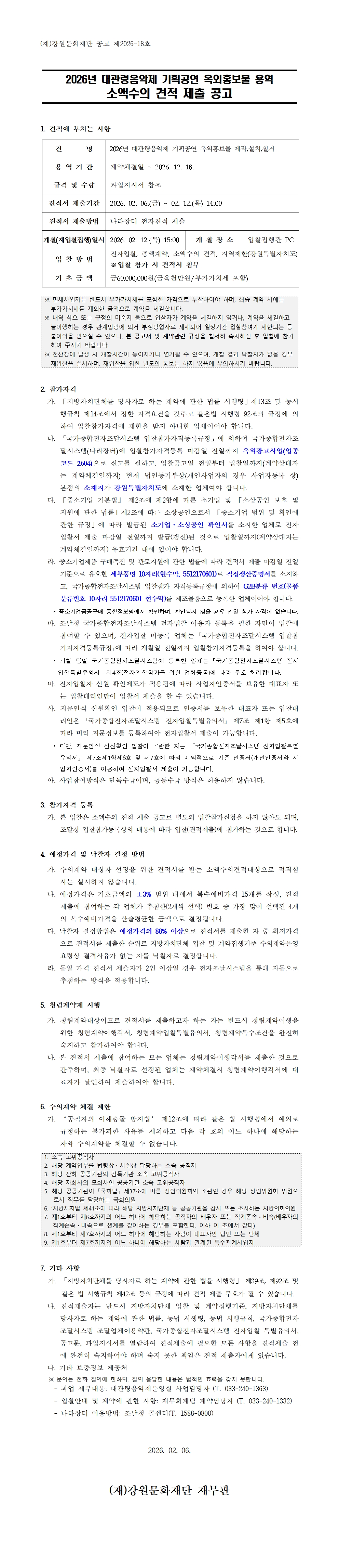 첨부파일: 붙임1. 소액수의 공고문(2026년 대관령음악제 기획공연 옥외홍보물 용역)_최종.hwp
